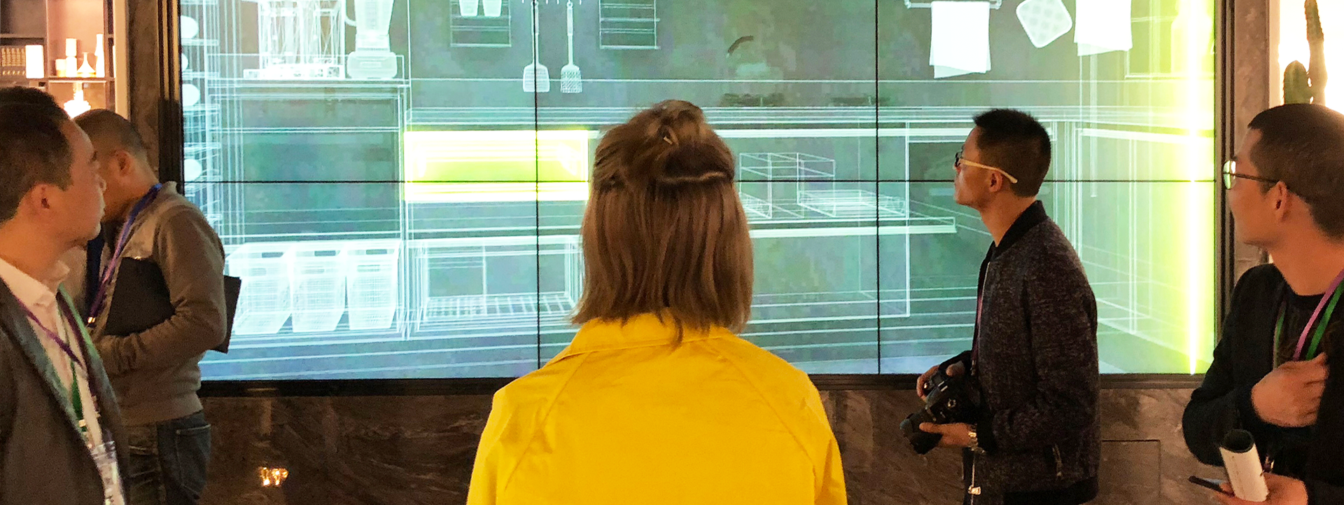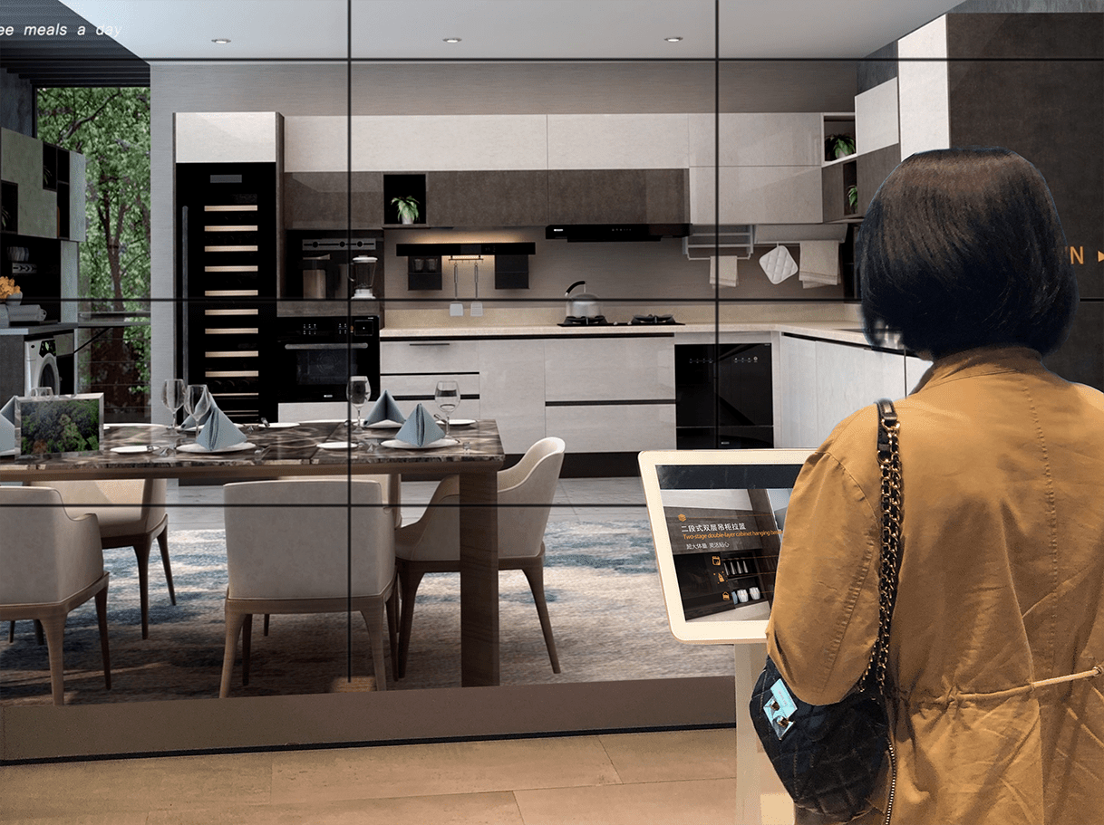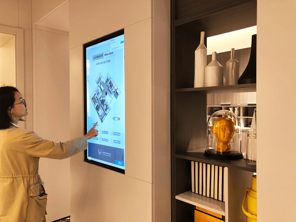 投放于样板间旁的触摸互动大屏,能即时满足消费者对种空间风格的搭配、选择需求,同时扩大展厅物理展示空间。